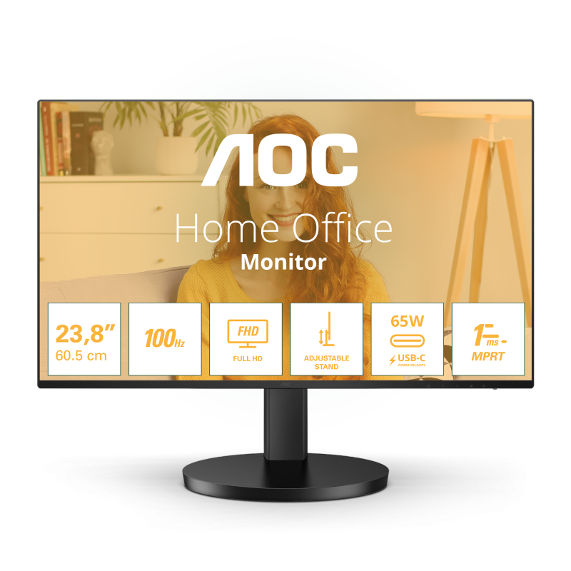 Monitor AOC 27″ 27B3CF2, Diagonal (inch): 27, Diagonal (cm): 69, Aspect ratio: 16:9, Panel: IPS, Resolution: 1920×1080, Refresh Rate: 100Hz, Response time GtG: 4ms, Response time MPRT: 1ms, Brightness (max): 250 cd/㎡, Contrast (static) : 1300:1, Contrast (dynamic): 20M:1, Viewing angle: 178°/178°, Color Gamut Type: NTSC, Color Gamut Coverage: 88.4%, Colours: 16.7M, Speakers: 2Wx2, VESA Wallmount: 100×100, Tilt: -5° ~ 25°, HAS: 110mm, HDMI: x1, USB Hub: x2 USB-A, USB-C: x1, USB-C Power Delivery: 65W, AUX: x1 3.5mm Audio OUT